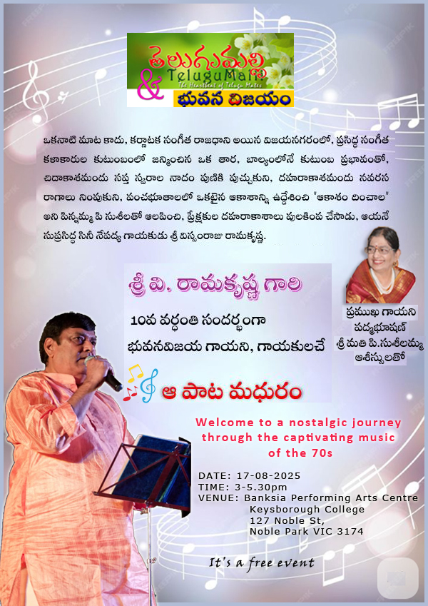 గాయకుడు శ్రీ రామకృష్ణ పదవ వర్ధంతిUpcoming events / July 25, 2025 17-08-2025 Banksia Performing Arts Center, 127 Noble St, Noble Park VIC 3174